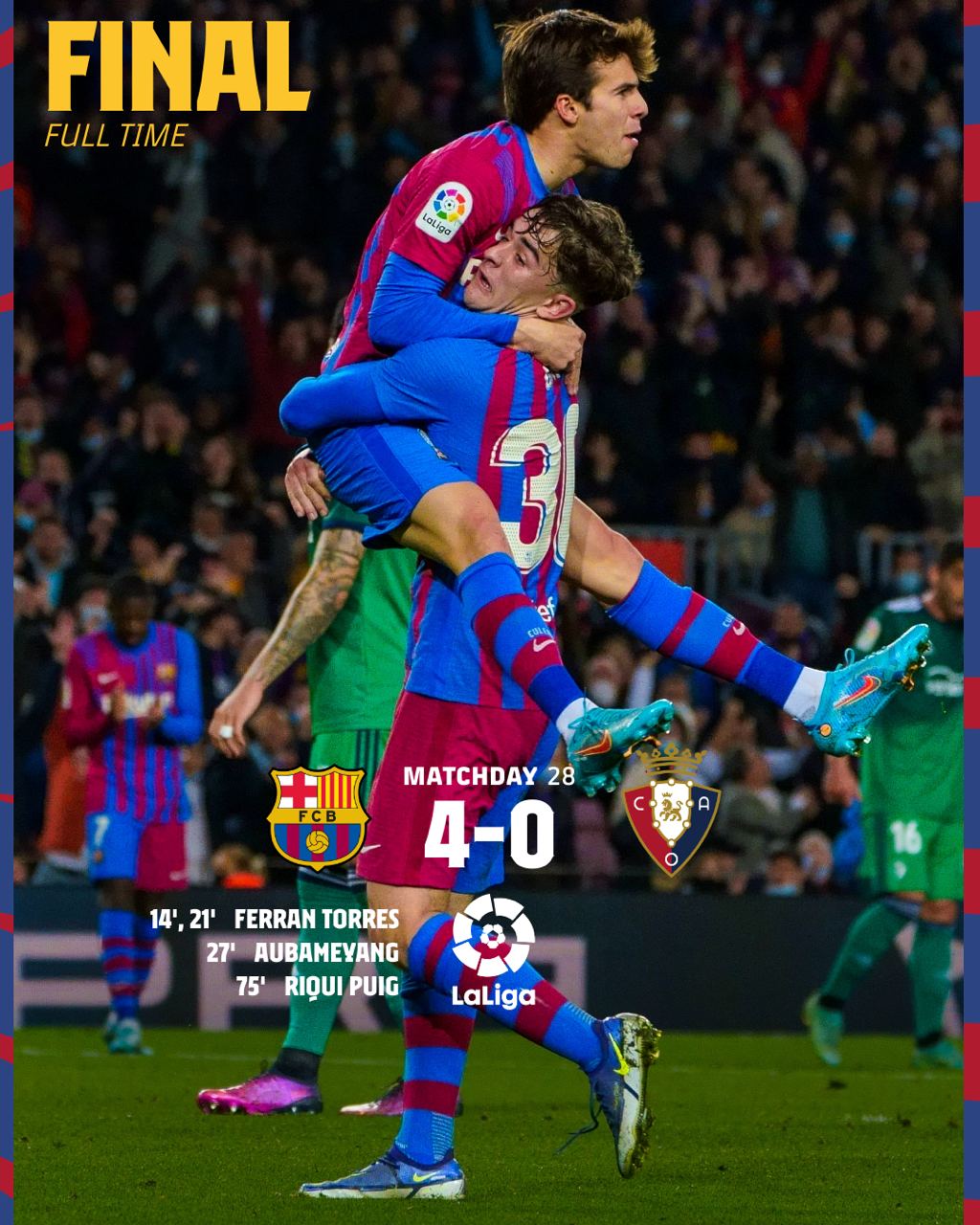 به گزارش دیلی فوتبال؛ تیم های بارسلونا و اوساسونا در چارچوب بازی های هفته 28 مسابقات لالیگا به مصاف یکدیگر رفتند که این بازی با نتیجه 4 بر صفر به سود آبی اناری ها به پایان رسید.