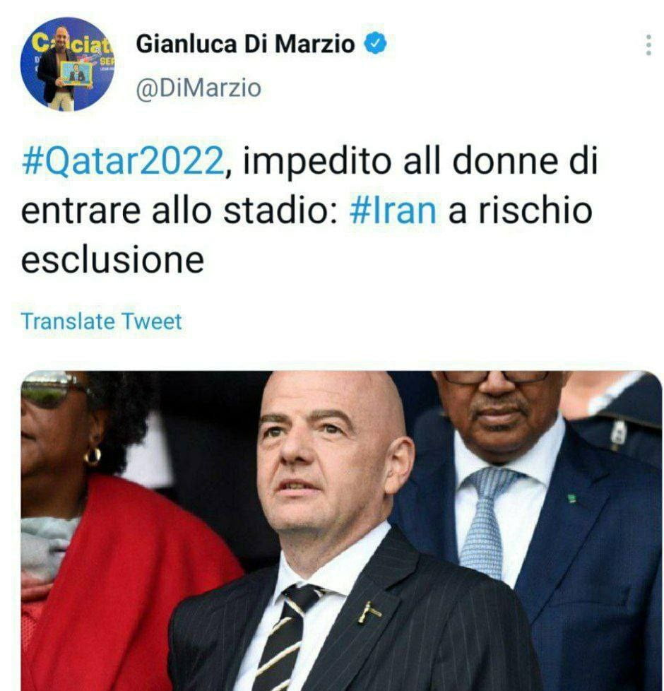 به گزارش دیلی فوتبال؛ جانلوکا دی مارزیو، خبرنگار معتبر فوتبال جهان از بررسی فیفا برای حذف تیم ملی ایران از جام جهانی 2022 قطر و تعلیق فدراسیون فوتبال (فوتبال ملی و باشگاهی) ایران خبر داد.