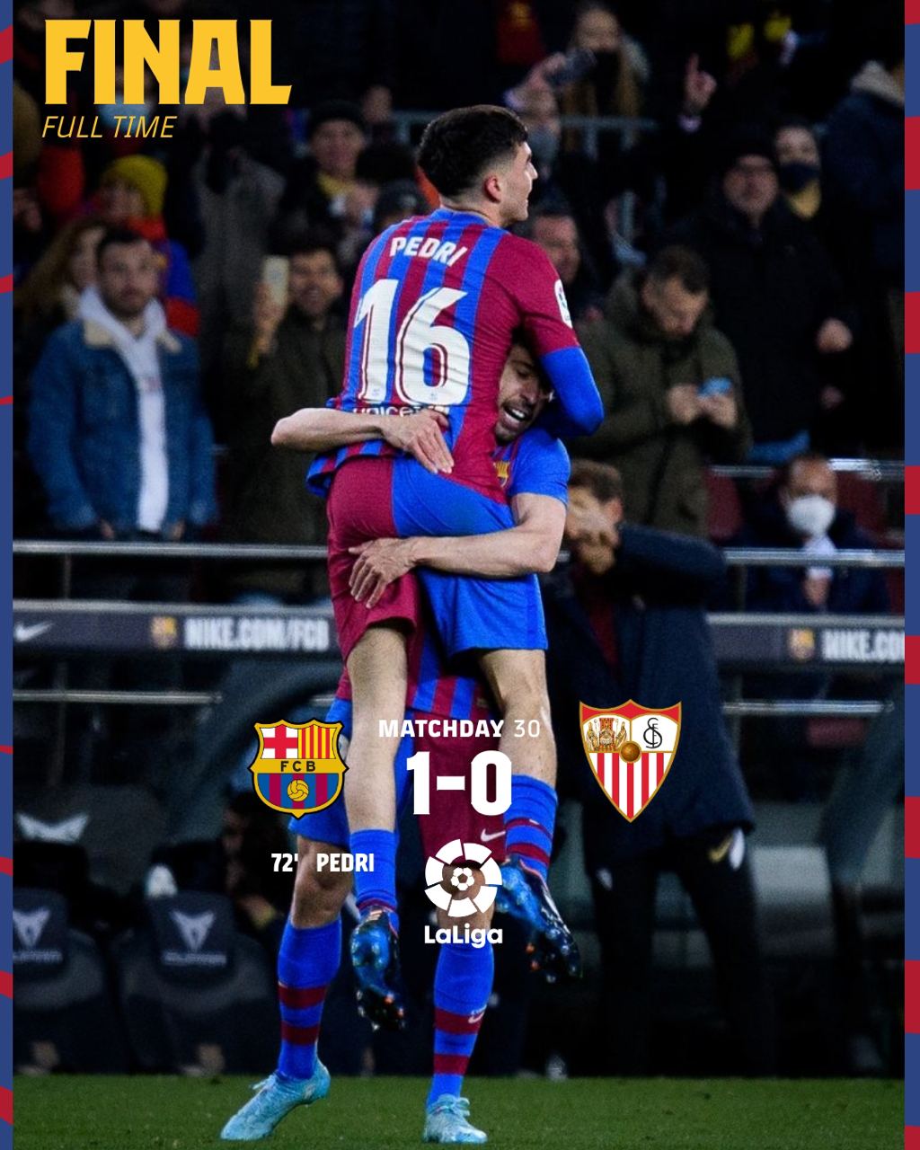 با این نتیجه تیم فوتبال بارسا با کسب شانزدهمین پیروزی فصل 57 امتیازی شد و به رتبه دوم جدول صعود کرد.