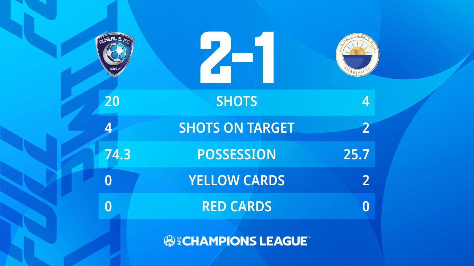 با این نتیجه تیم فوتبال الهلال عربستان با کسب اولین پیروزی 3 امتیازی شد و در رتبه دوم جدول گروه A لیگ قهرمانان آسیا ماند.