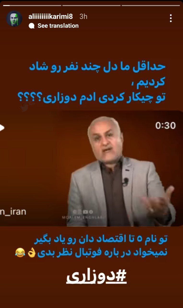 عکس استوری علی کریمی در واکنش به اظهارات جنجالی حسن عباسی درباره بازیکنان فوتبال که در اینستاگرام منتشر شده است را تماشا کنید.