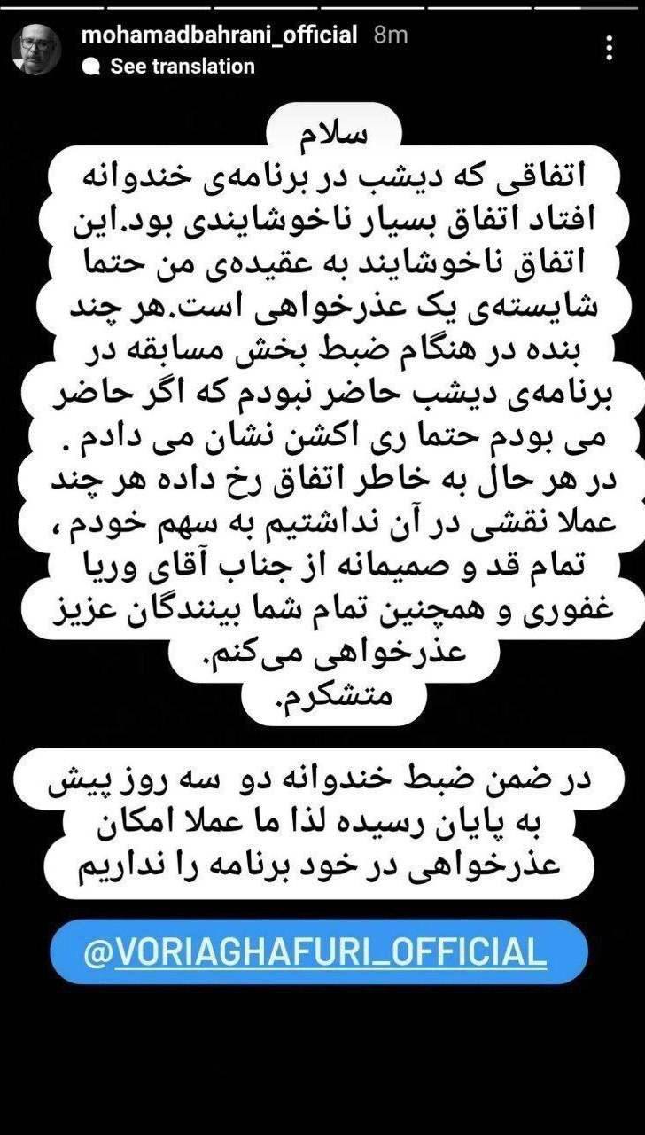 عکس عذرخواهی محمد بحرانی (جناب خان) به خاطر سانسور وریا غفوری در برنامه خندوانه که در اینستاگرام منتشر شده است را تماشا کنید.