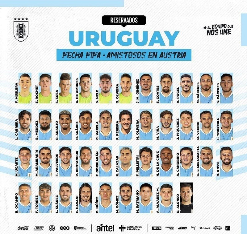 در لیست اعلامی تمام ستارگان اروگوئه از جمله ادینسون کاوانی، لوییس سوارز و فدریکو والورده ستاره رئال مادرید حضور دارند.