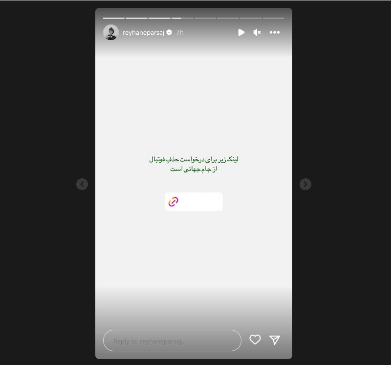 در این استوری که ریحانه پارسا با دنبال کنندگانش به اشتراک گذاشت، او از مخاطبانش خواست تا به کمپین حذف تیم ملی فوتبال ایران از مسابقات جام جهانی بپیوندند.
