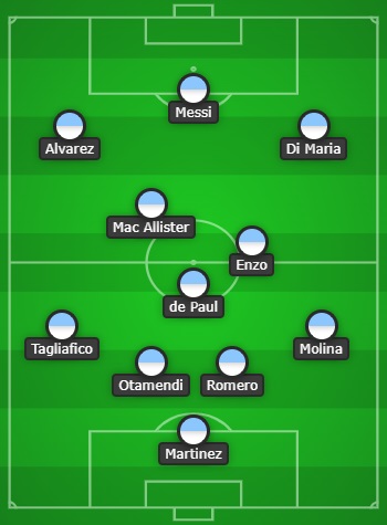امیلیانو مارتینز، اوتامندی، رومرو، مولینا، تالیافیکو، رودریگو دی پائول، انزو فرناندز، مک آلیستر، آنخل دیماریا، خولیان آلوارز و لیونل مسی