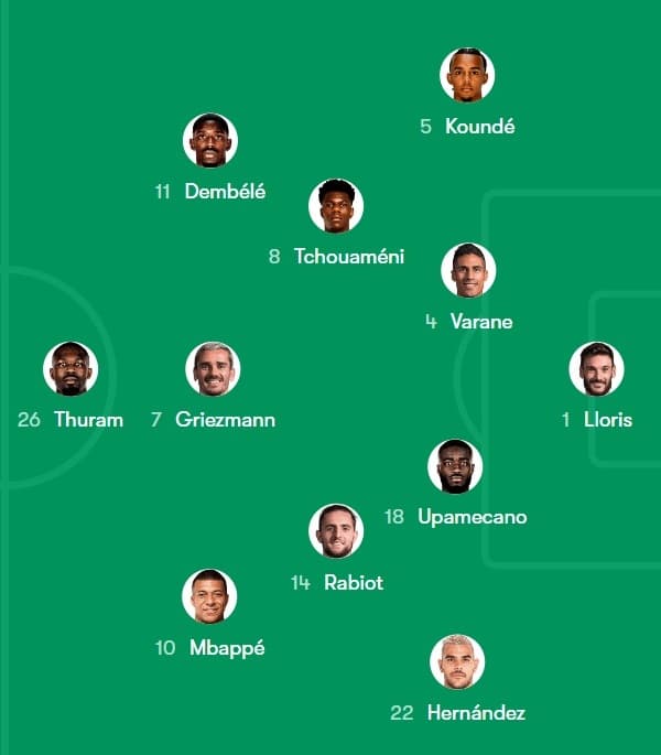 هوگو لوریس، ژول کونده، رافائل واران، اوپامکانو، تئو هرناندز، اورلین شوامنی، آدریان ربیو، آنتوان گریزمان، عثمان دمبله، کیلیان امباپه و تورام