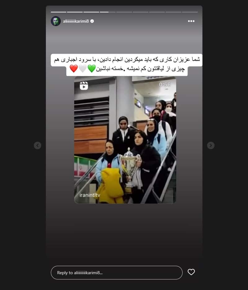 عکس استوری علی کریمی و خشم او از اجرای سرود ملی توسط دختران فوتسالیست ایران که در اینستاگرام منتشر شده است را تماشا کنید.