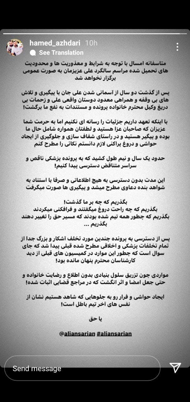 در این متن که حامد اژدری در شبکه های اجتماعی به اشتراک گذاشته، وی مدعی شد: بدون اجازه خانواده، به علی انصاریان سلول بنیادی تزریق شد!