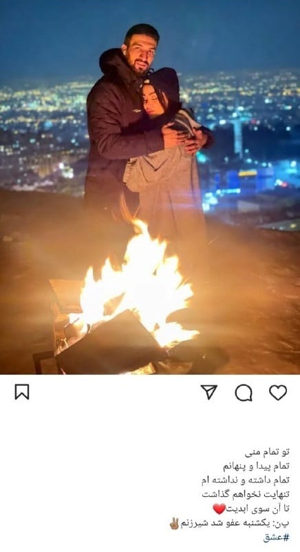 در این تصویر که حسین ماهینی به مناسبت ولنتاین در شبکه های اجتماعی به اشتراک گذاشته، بازیکن پرسپولیسی در کنار همسر خود دیده می شود و در متن پست آمده است: «یکشنبه شیر زنم عفو شد».