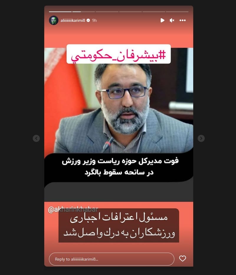 عکس توهین بی شرمانه علی کریمی به قربانیان حادثه سقوط بالگرد وزیر ورزش که در اینستاگرام منتشر شده است را تماشا کنید.