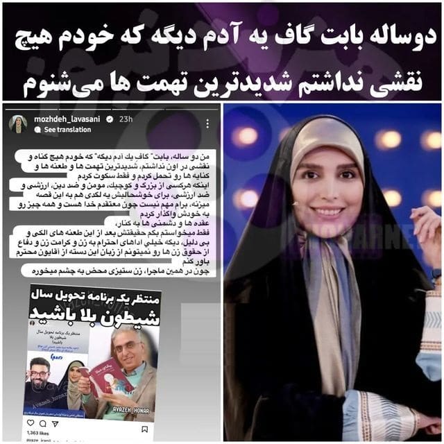به گزارش سرویس منهای فوتبال؛ مژده لواسانی مجری مشهور تلویزیون ایران با انتشار یک عکس نوشته در اینستاگرام به توهین های برخی سردهندگان شعار «زن زندگی آزادی» واکنش تندی نشان داد.