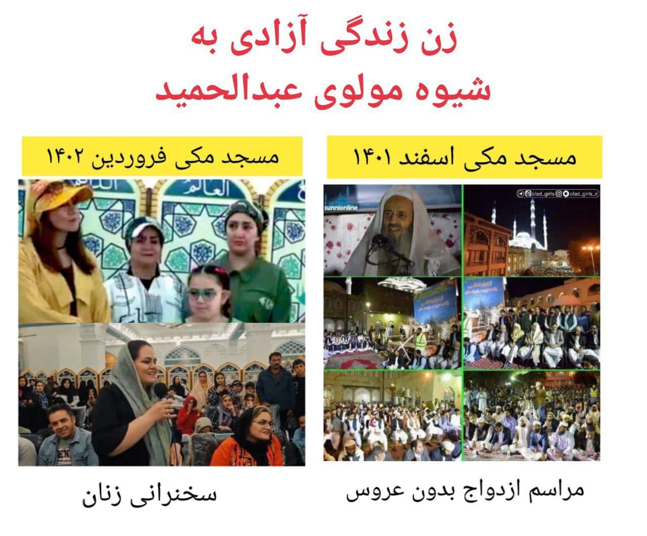 در این تصویر که در فضای مجازی فراگیر شده، حضور زنان بی حجاب در مسجد مکی زاهدان در فروردین 1402 با مراسم ازدواج جوانان در اسفند 1401 بدون حضور عروس در محضر مولوی عبدالحمید مقایسه شده است.