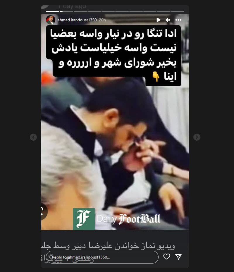 عکس توهین احمد ایراندوست به نماز خواندن علیرضا دبیر که در اینستاگرام منتشر شده است را تماشا کنید.