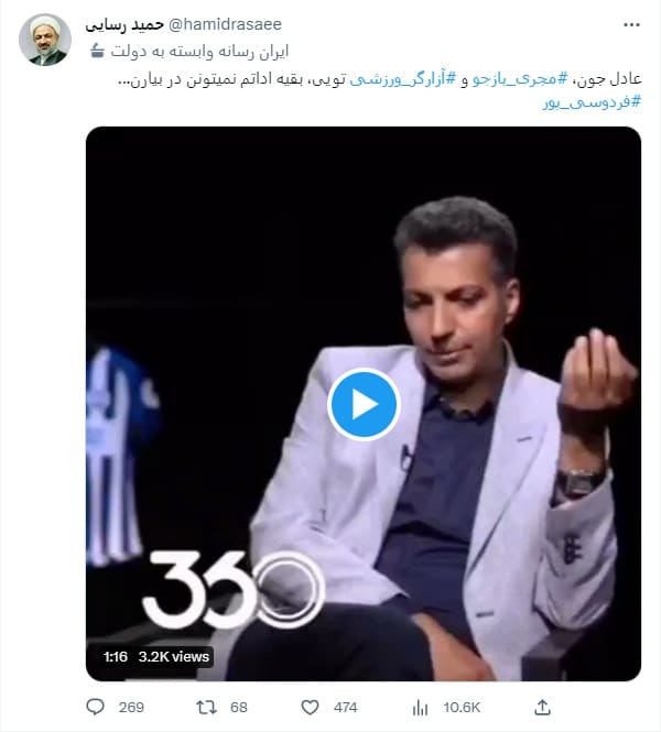 عکس واکنش تند حمید رسایی به مصاحبه عادل فردوسی پور با علیرضا جهانبخش که در توییتر منتشر شده است را تماشا کنید.