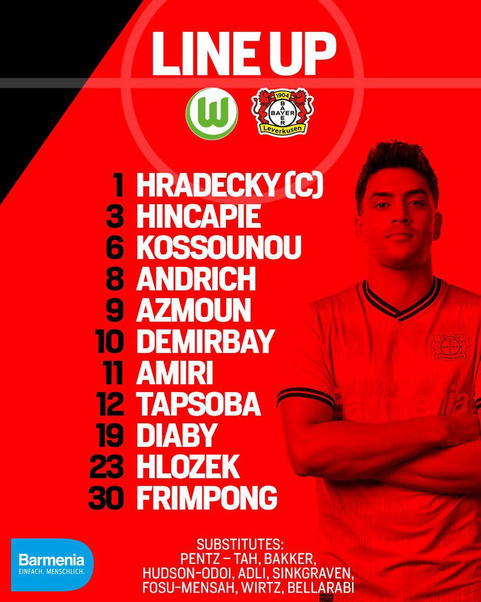 سردار آزمون در ترکیب بایرلورکوزن مقابل ولفسبورگ برای بازی امشب 27 فروردین 1402