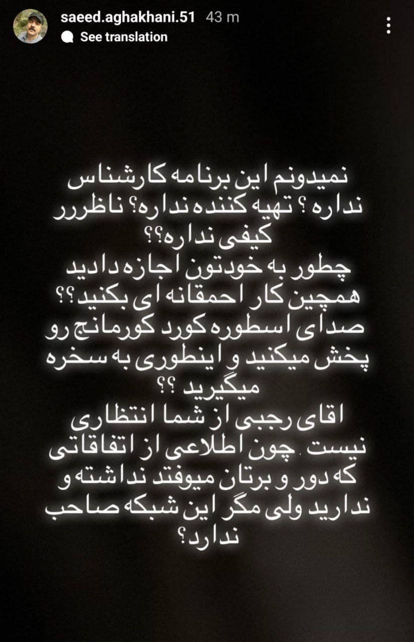 در این تصویر که سعید آقاخانی در فضای مجازی به اشتراک گذاشته، این بازیگر مشهور ایرانی با پیامی توهین آمیز خطاب به مهران رجبی، انتقاد شدیدی از تقلید صدای سهراب محمدی استاد موسیقی کرمانجی داشته است.