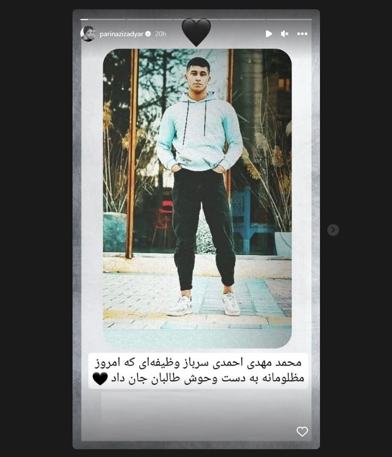 عکس واکنش پریناز ایزدیار به شهادت سرباز مرزبانی توسط تروریست های طالبان که در اینستاگرام منتشر شده است را تماشا کنید.