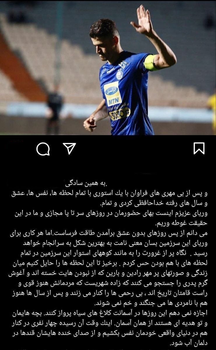 به گزارش دیلی فوتبال؛ مونا اردلان همسر وریا غفوری با انتشار عکس نوشته ای در اینستاگرام به خداحافظی کاپیتان پیشین استقلال از دنیای فوتبال واکنش نشان داد.