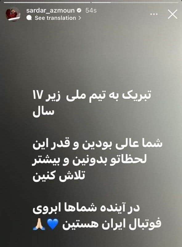 در این استوری اینستاگرامی که سردار آزمون در فضای مجازی به اشتراک گذاشته، مهاجم ملی پوش بایرلورکوزن ضمن تبریک صعود نوجوانان به جام جهانی، آنها را آینده فوتبال ایران دانست.