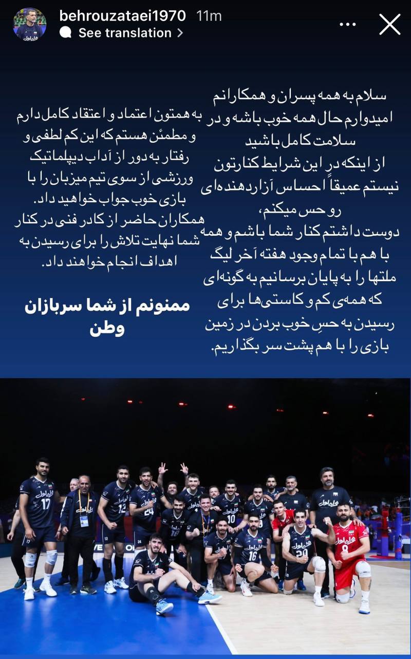 در این استوری اینستاگرامی که بهروز عطایی در فضای مجازی به اشتراک گذاشته، سرمربی تیم ملی والیبال مردان ایران خطاب به شاگردانش نوشته است: «مطمئن هستم که رفتار به دور از آداب دیپلماتیک ورزشی از سوی تیم میزبان را با بازی خوب جواب خواهید داد».