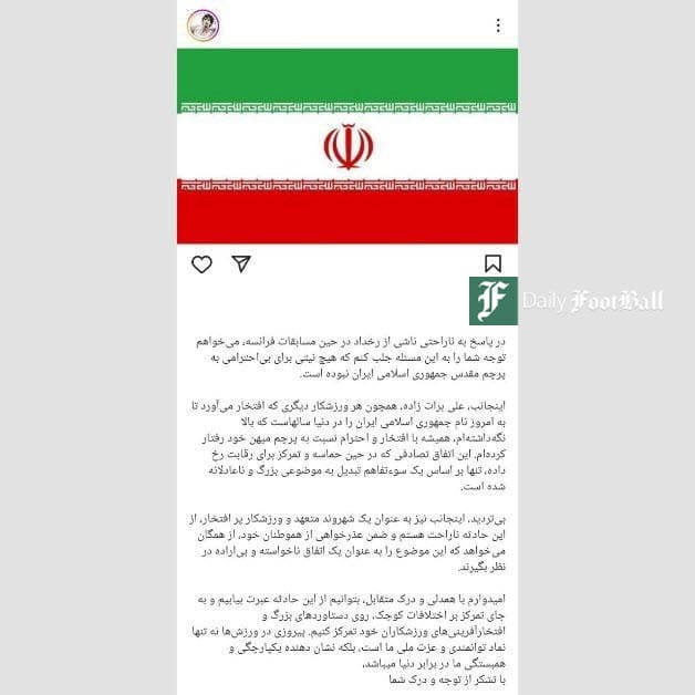 عکس عذرخواهی علی برات زاده پس از بی احترامی به پرچم ایران؛ از لایک پست های علی کریمی تا حواس پرتی در افتتاحیه که در اینستاگرام منتشر شده است را تماشا کنید.