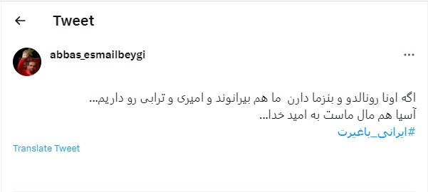در این توییت که عباس اسماعیل بیگی در فضای مجازی به اشتراک گذاشته، لیدر باشگاه پرسپولیس به عنوان یکی از تیم های نماینده ایران در لیگ قهرمانان آسیا نوشته است: اگه اونا رونالدو و بنزما دارن ما هم بیرانوند و امیری و ترابی رو داریم.