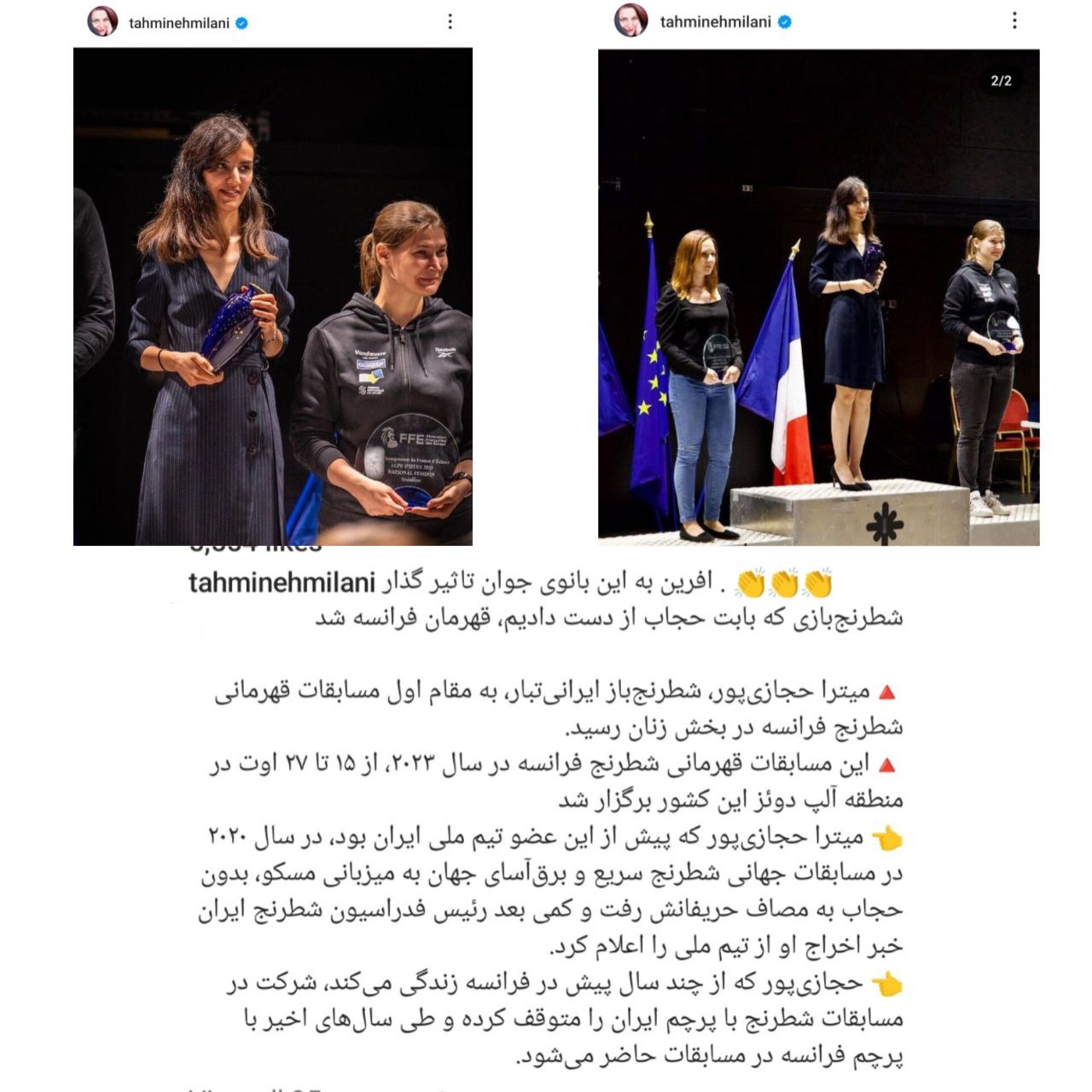 به گزارش سرویس منهای فوتبال؛ تهمینه میلانی با انتشار عکس نوشته ای در اینستاگرام پس از قهرمانی میترا حجازی پور در مسابقات شطرنج فرانسه از این ورزشکار کشف حجاب کرده حمایت کرد.