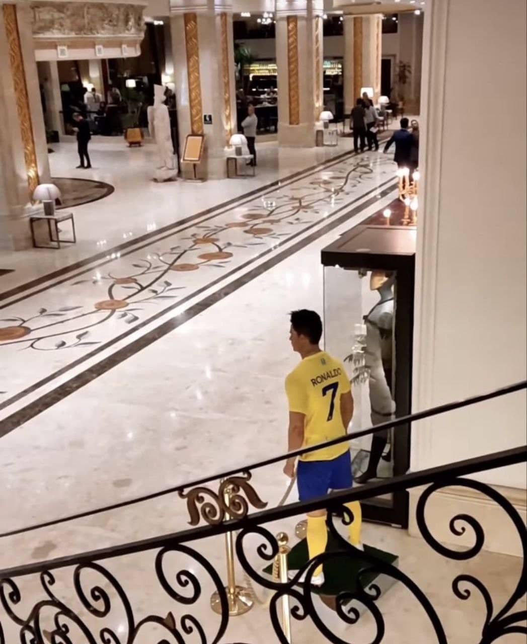در این تصویر که در شبکه های اجتماعی فراگیر شده، پس از حضور کاروان تیم النصر عربستان در ایران و استقرار بازیکنان در هتل اسپیناس پالاس تهران، مسئولان این هتل اقدام به نصب مجسمه کریس رونالدو فوق ستاره پرتغالی فوتبال جهان کردند.