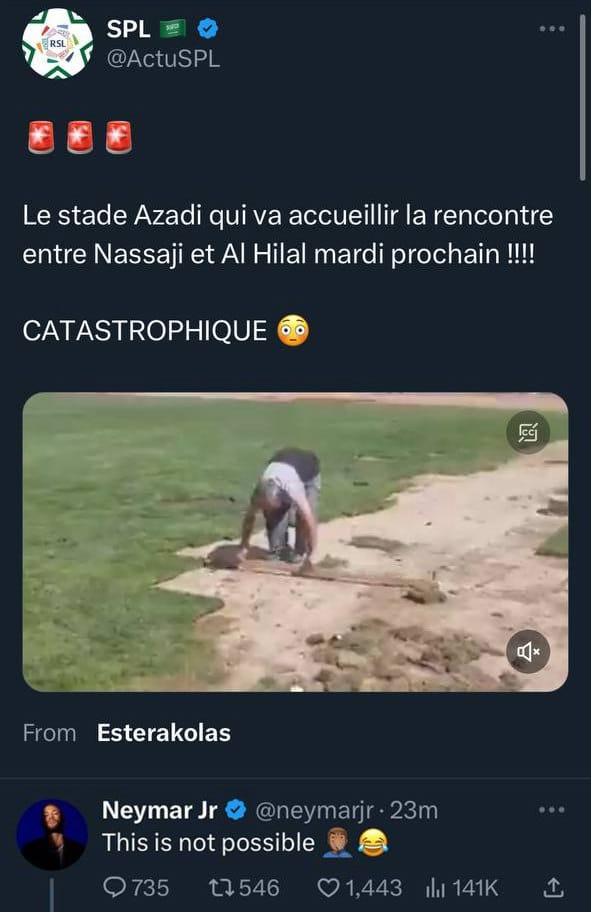 به گزارش سرویس منهای فوتبال؛ نیمار جونیور فوق ستاره برزیلی تیم الهلال با انتشار پستی در توییتر به روش عجیب ترمیم چمن ورزشگاه آزادی تهران واکنش طنزی نشان داد.
