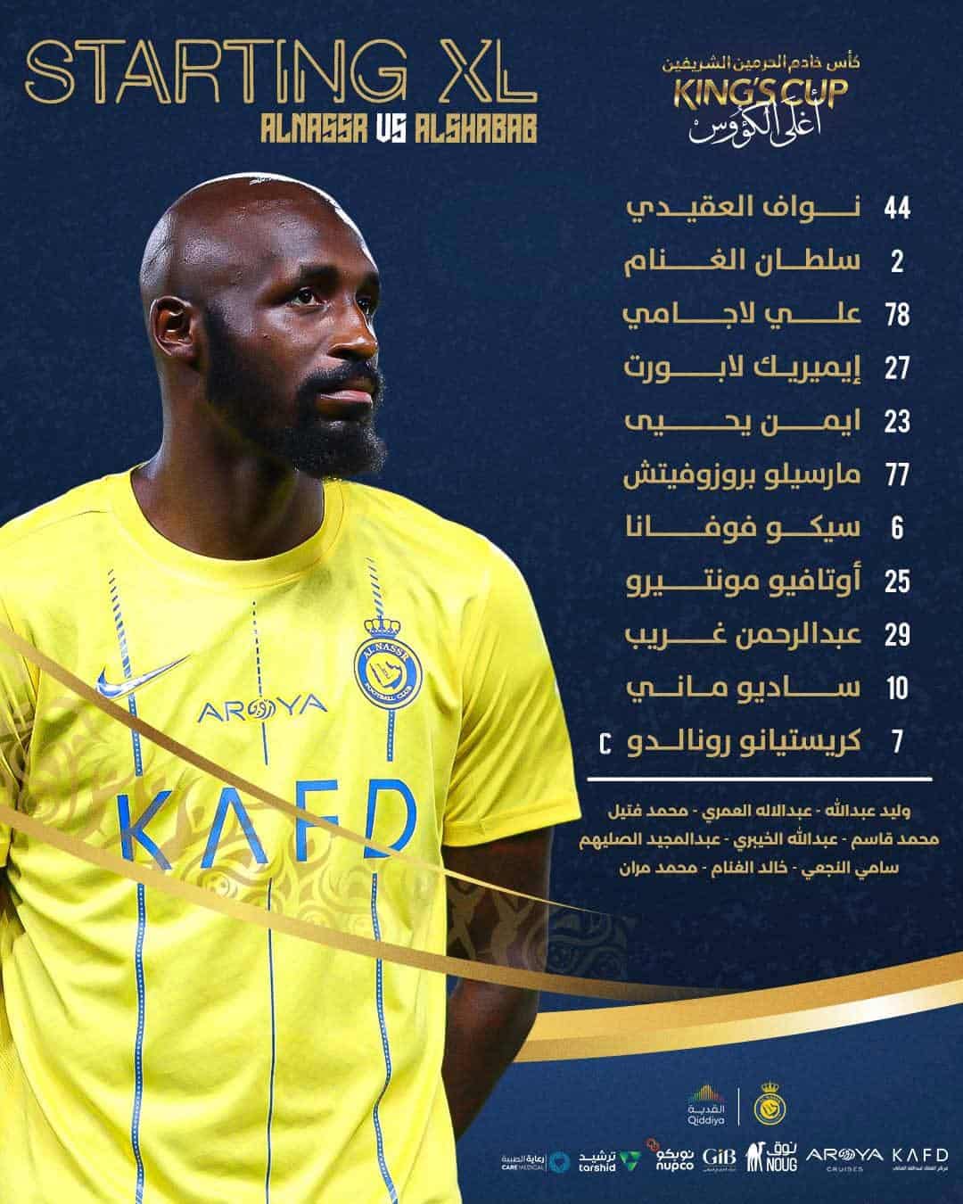 گفتنی است، کریستیانو رونالدو فوق ستاره پرتغالی النصر در ترکیب اصلی این تیم برای بازی با الشباب قرار گرفته و کاپیتان تیمش است.
