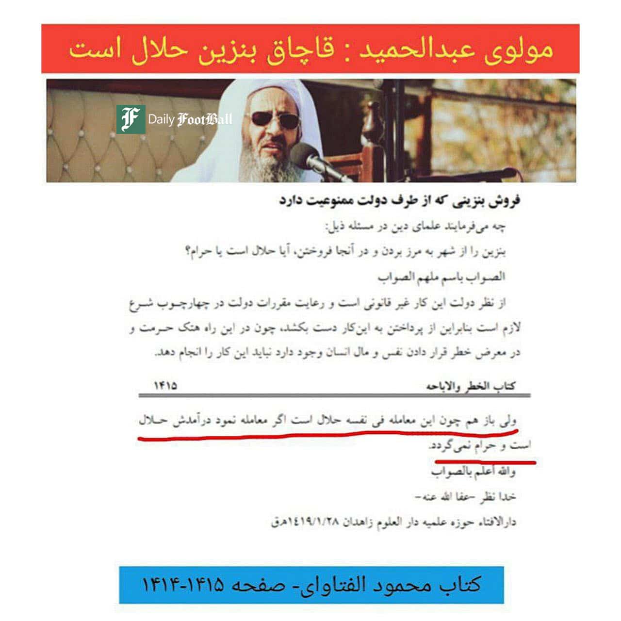 در این تصویر که با واکنش های منفی گسترده کاربران در شبکه های اجتماعی مواجه شده، مولوی عبدالحمید امام جمعه مسجد مکی زاهدان در حکمی درآمد حاصل از قاچاق سوخت به خارج از کشور را حلال اعلام می کند.