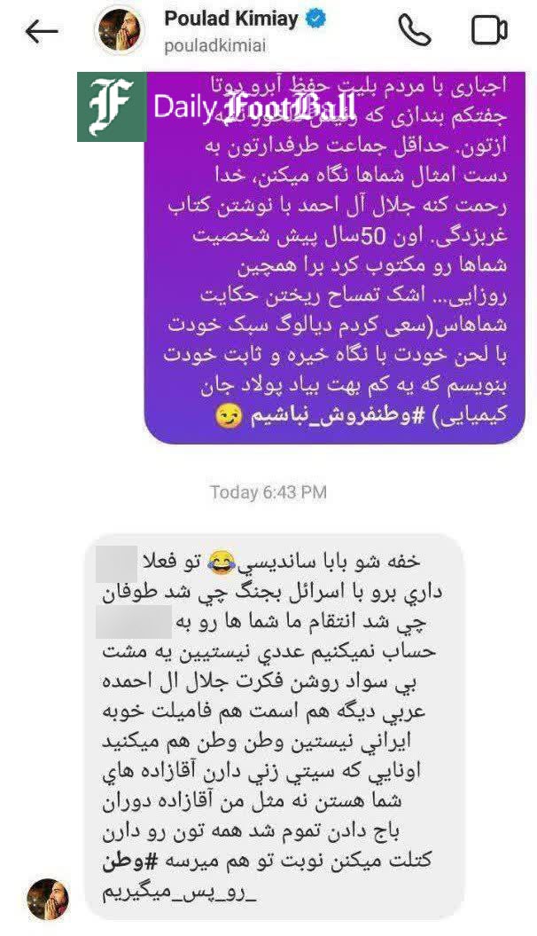 در این تصویر که با واکنش های منفی گسترده کاربران در شبکه های اجتماعی مواجه شده، پولاد کیمیایی بازیگر سابق سینمای ایران در پاسخ به انتقاد کاربری از سکوت وی در قبال حادثه تروریستی کرمان، با الفاظ رکیک توهین های بی شرمانه ای به ملت ایران کرد.