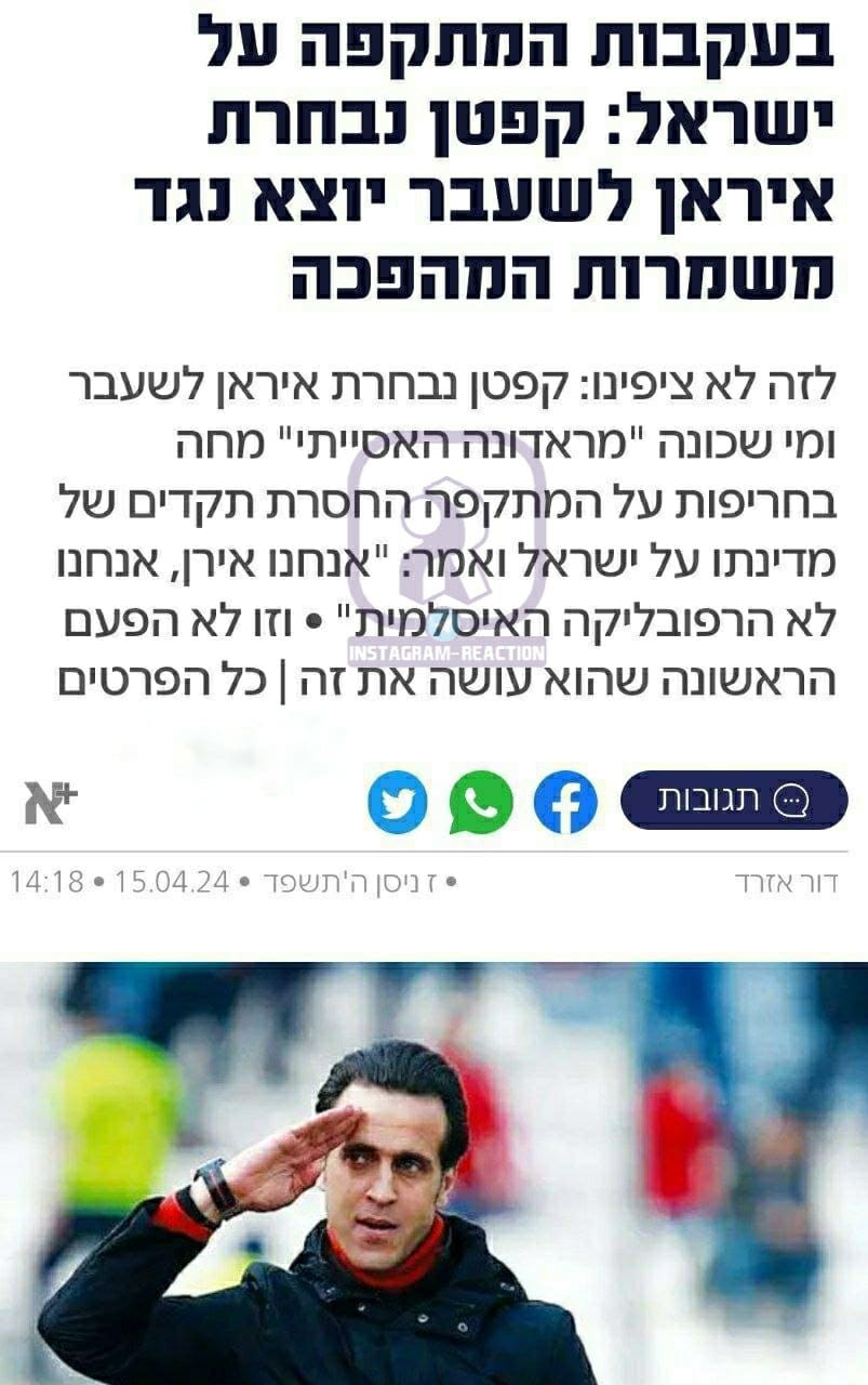 در این تصویر که با واکنش های متفاوت کاربران در شبکه های اجتماعی مواجه شده، یک رسانه رژیم صهیونیستی نوشت: «انتظار نمی رفت بازیکن پیشین تیم ملی ایران به کشور خود به خاطر عملیات علیه اسرائیل حمله کند».