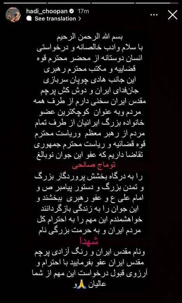 در این تصویر که هادی چوپان در فضای مجازی به اشتراک گذاشته، این ورزشکار سرشناس تقاضای بخشش حکم اعدام توماج صالحی را از مقامات کشور مطرح کرد.
