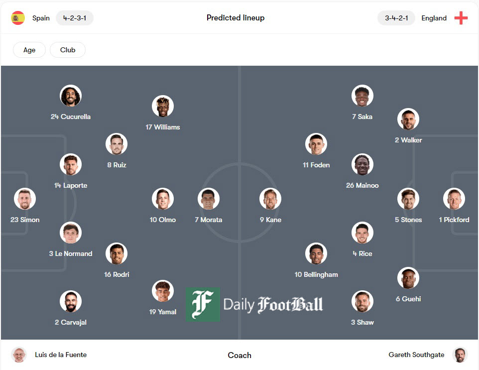 اسپانیا: سیمونز، لاگورت، لو نورمند، کارواخال، کوکوریا، رودری، فابیان رویز، لامین یامال، نیکو ویلیامز، دنی اولمو و آلوارو موراتا