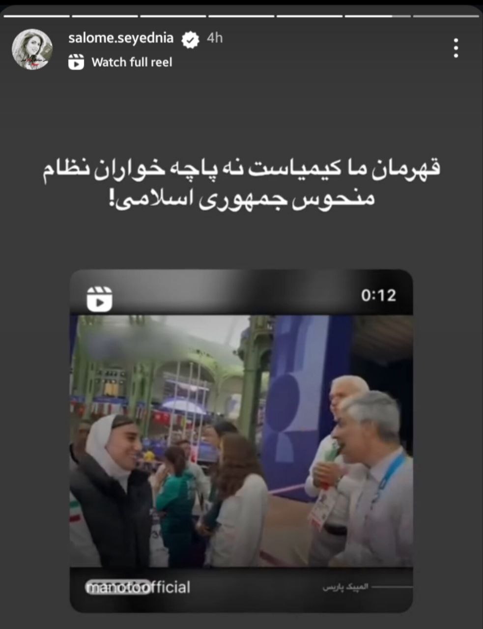 عکس عصبانیت سالومه سیدنیا از درخشش ناهید کیانی و مبینا نعمت زاده در المپیک 2024 پاریس که در اینستاگرام منتشر شده است را تماشا کنید.