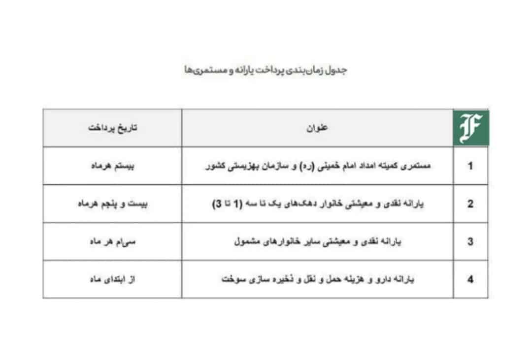 همچنین، بر اساس اعلام سازمان هدفمندی یارانهها، یارانه نقدی و معیشتی خانوار دهکهای اول تا سوم درآمدی بیست و پنجم هر ماه پرداخت میشود. ضمن اینکه یارانه سایر خانوارهای مشمول نیز سیام هر ماه به دستشان میرسد. براساس جدولی که این سازمان ارائه کرده، مستمری کمیته امداد امام خمینی (ره) و سازمان بهزیستی بیستم هر ماه و یارانه دارو و هزینه حمل و نقل و ذخیرهسازی سوخت از ابتدای ماه پرداخت میشود.