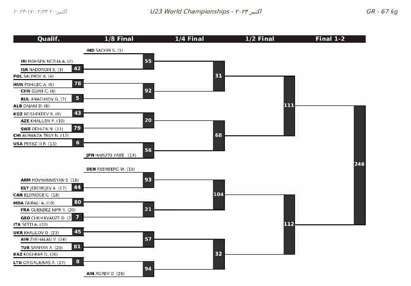بر اساس قرعه کشی احمدرضا محسن نژاد فرنگی کار وزن 67 کیلوگرم و یکی از شانس های کسب مدال در این رقابت ها با بدشانسی مواجه شد و ورزشکاری از رژیم اشغالگر قدس حریف کشتی گیر ایرانی شد.