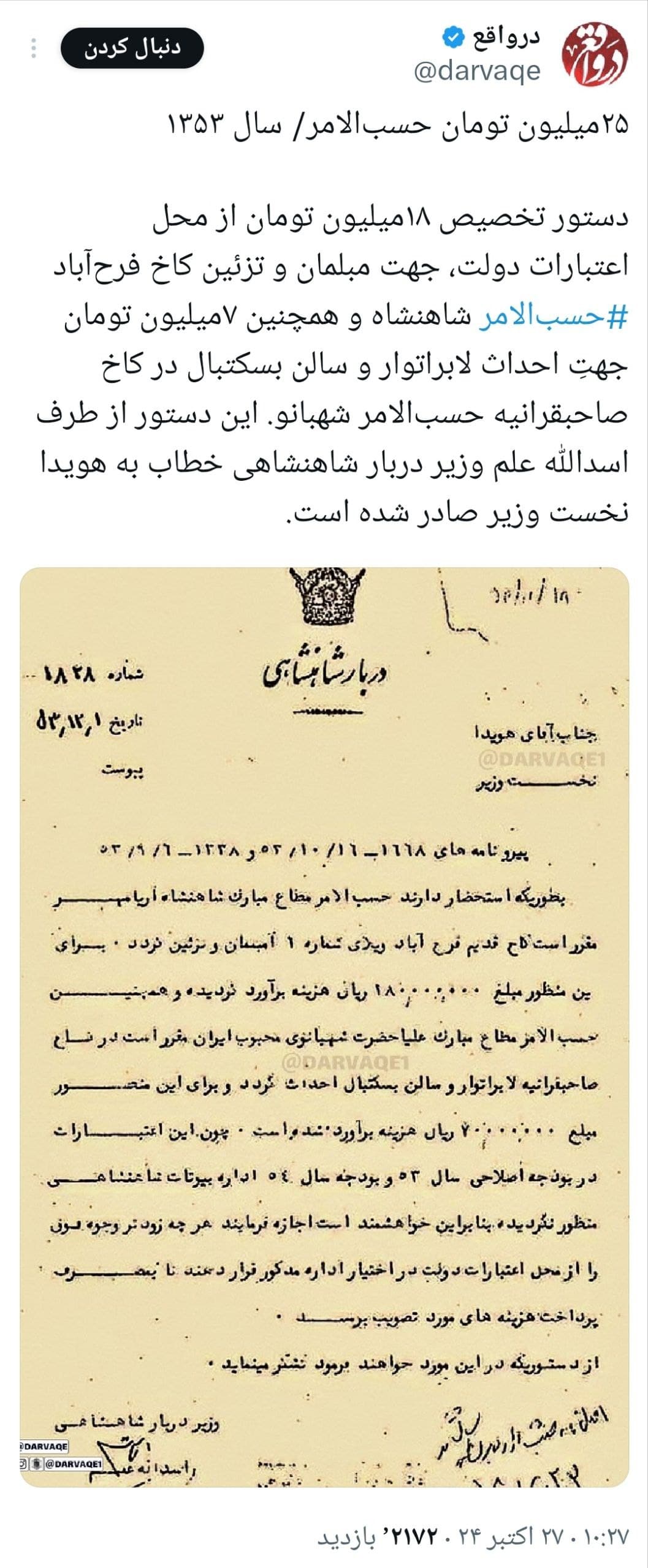 در این تصویر که علی اکبر رائفی پور در فضای مجازی به اشتراک گذاشته، این نظریه پرداز ایرانی از خرج 4 میلیون دلاری دربار پهلوی برای مبلمان و سالن بسکتبال فرح از محل اعتبارات دولتی خبر داد.