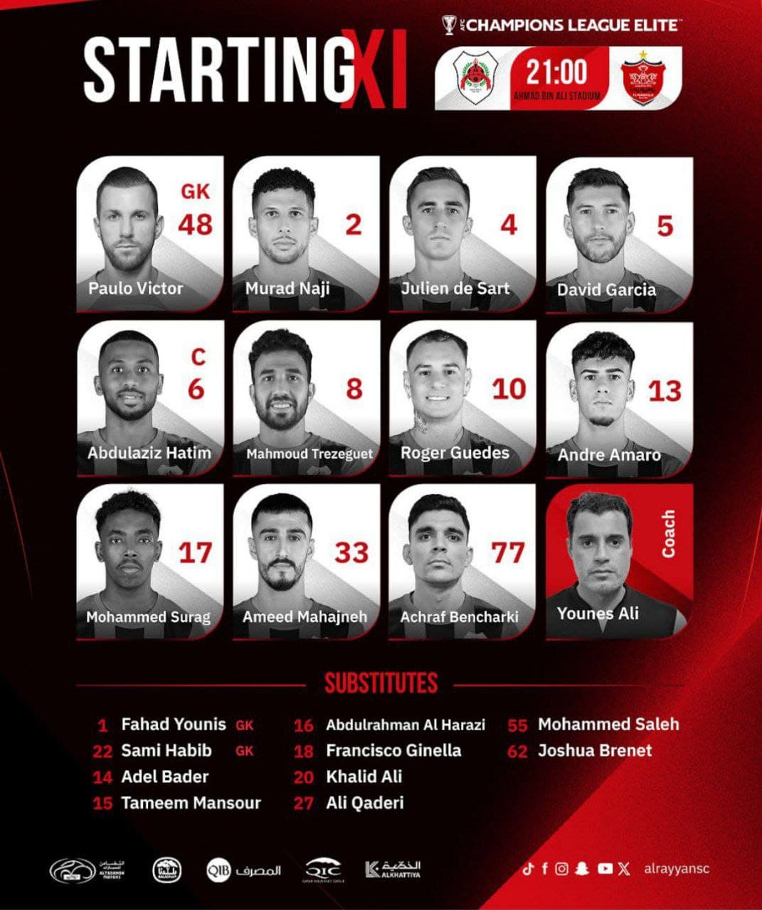 ترکیب الریان برابر پرسپولیس برای بازی امشب 5 آذر 1403