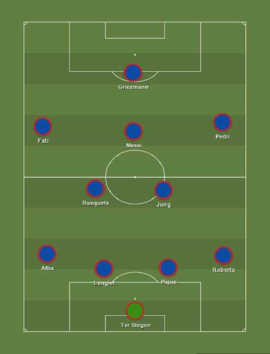 تراشتگن، پیکه، لنگله، آلبا، روبرتو، بوسکتس، دی یونگ، مسی، فاتی، پدری و گریزمان