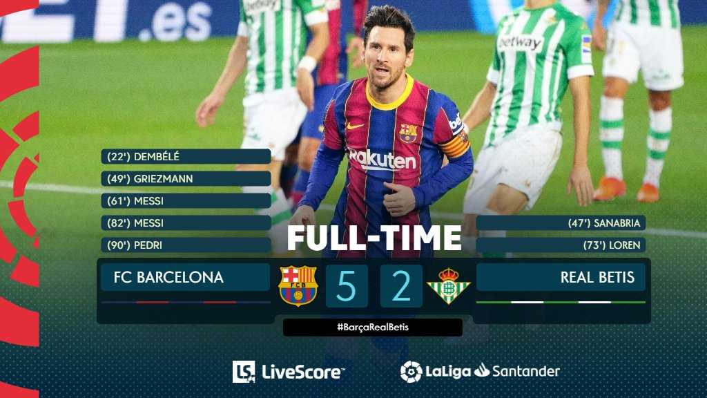 به گزارش دیلی فوتبال؛ تیم های بارسلونا و رئال بتیس در چارچوب بازی های هفته نهم لالیگا به مصاف یکدیگر رفتند که این بازی با نتیجه 5 بر 2 به سود بارسا به پایان رسید.