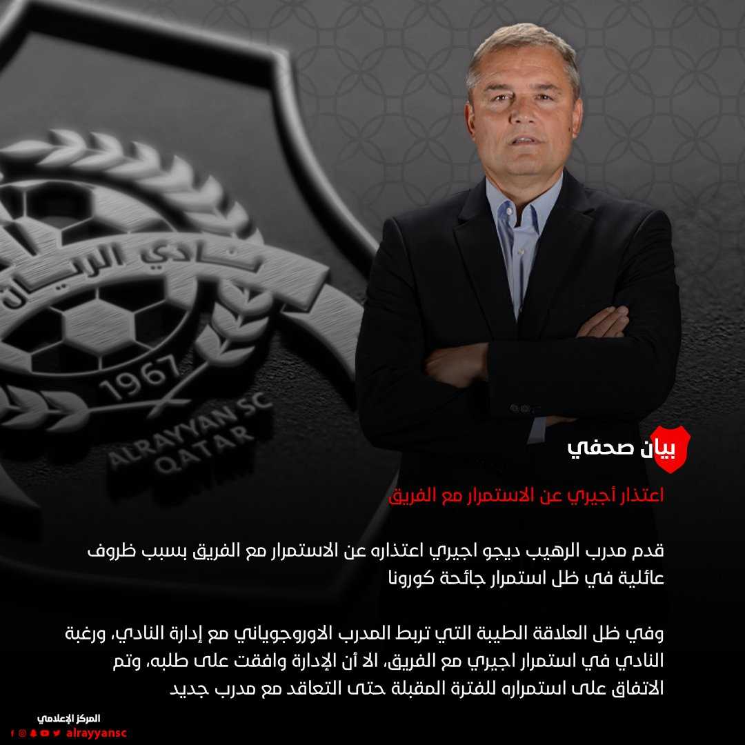 به گزارش دیلی فوتبال؛ باشگاه الریان قطر با انتشار بیانیه ای اعلام کرد آگیره سرمربی این تیم به دلیل مشکلات خانوادگی در رابطه با ویروس کرونا از سمتش استعفا کرد.