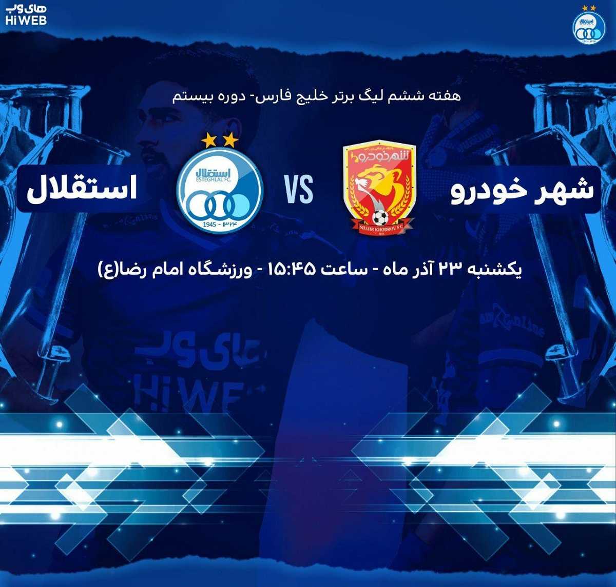 گفتنی است بازی استقلال و شهرخودرو امروز یکشنبه 23 آذر 99 ساعت 15:45 برگزار می شود.