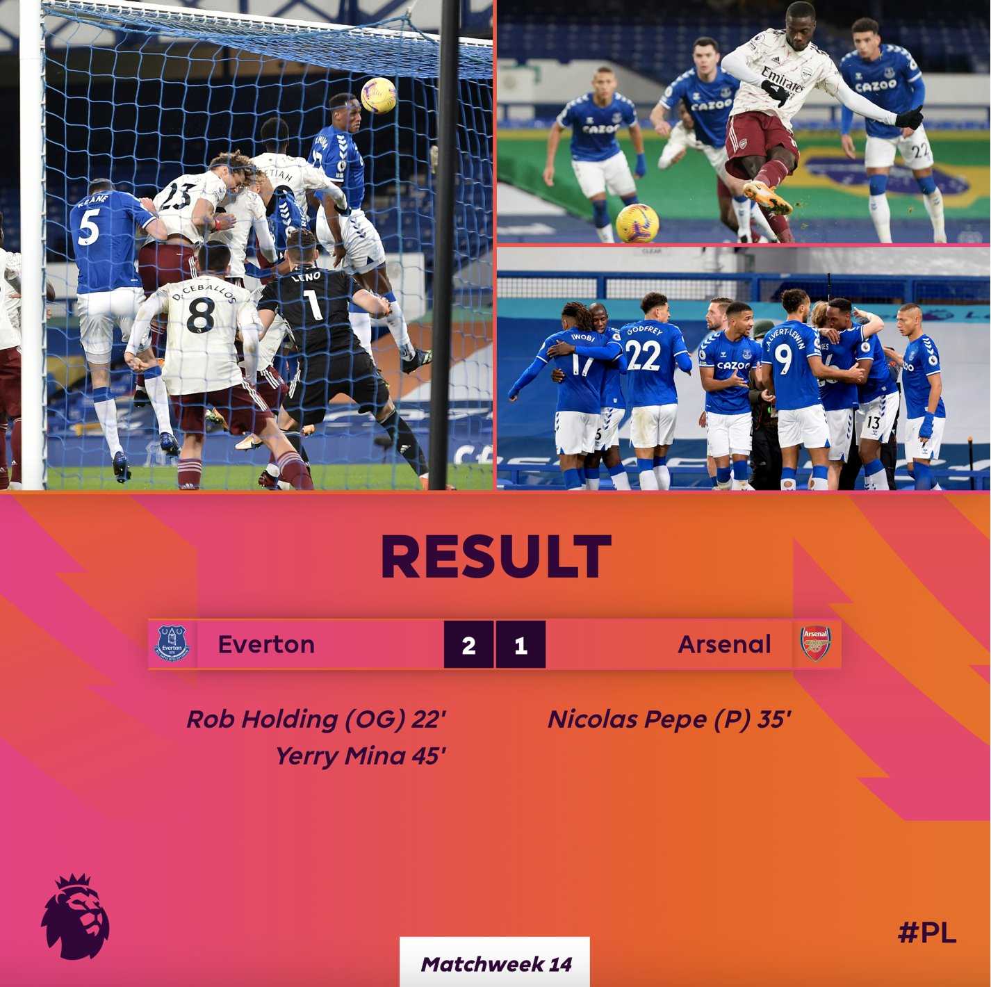 گل های این بازی را هولدینگ (گل به خودی) در دقیقه 22 و مینا در دقیقه 45 برای اورتون و نیکلاس په په در دقیقه 35 از روی نقطه پنالتی برای آرسنال به ثمر رساندند.