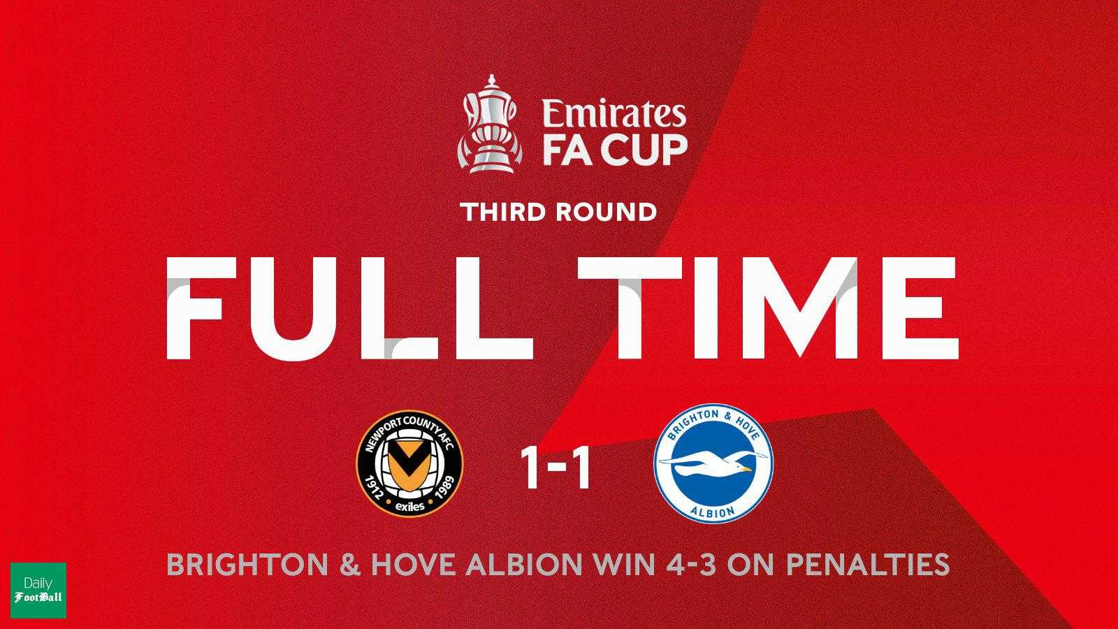 به گزارش دیلی فوتبال؛ تیم های نیوپورت کانتی و برایتون در چارچوب بازی های دور سوم رقابت های جام حذفی انگلیس به مصاف یکدیگر رفتند که وقت های قانونی و اضافه این بازی با نتیجه تساوی یک بر یک به پایان رسید.