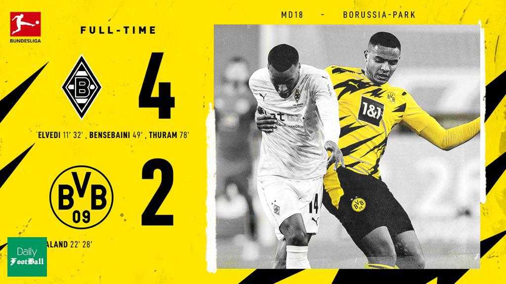 گل های این بازی را نیکو الودی در دقایق 11 و 32، رامی بنسباینی در دقیقه 49 و مارکوس تورام در دقیقه 78 برای مونشن گلادباخ و ارلینگ هالاند در دقایق 22 و 28 برای دورتموند به ثمر رساندند.