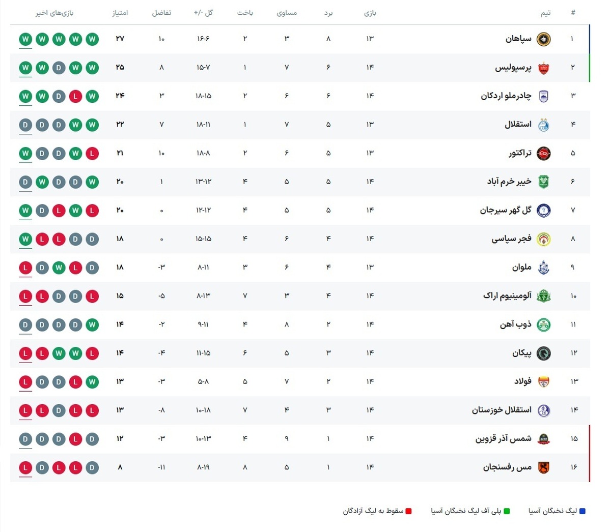 عکس| جدول رده بندی لیگ برتر در پایان هفته 14؛ صدرنشینی سپاهان، چادرملو مدعی جدید
