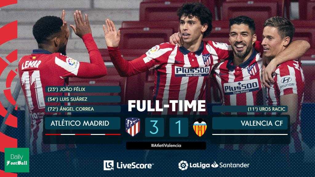 به گزارش دیلی فوتبال؛ تیم های اتلتیکو مادرید و والنسیا در چارچوب بازی های هفته بیستم رقابت های لالیگا به مصاف یکدیگر رفتند که این بازی با نتیجه 3 بر یک به سود اتلتیکومادرید به پایان رسید.