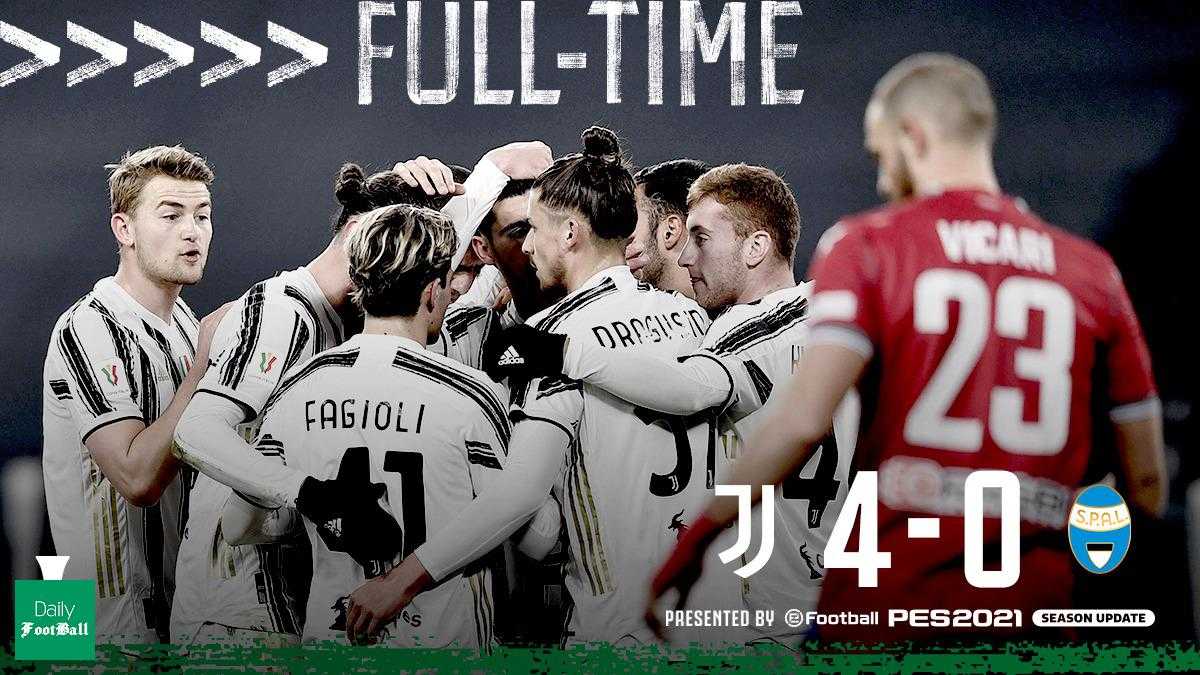 به گزارش دیلی فوتبال؛ تیم های یوونتوس و اسپال در چارچوب بازی های مرحله یک چهارم نهایی مسابقات جام حذفی ایتالیا به مصاف یکدیگر رفتند که این بازی با نتیجه 4 بر صفر به سود یووه به پایان رسید.